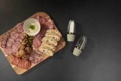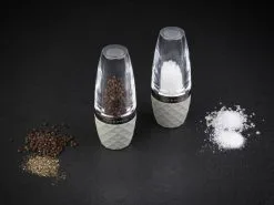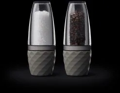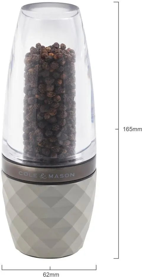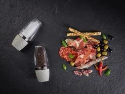 Ein stilvolles und zeitgemässes Pfeffer-und Salzmühlen-Set, das von der urbanen britischen Architektur inspiriert wurde. Hergestellt aus kristallklarem Acryl und Beton. Die klare Acrylplatte bildet einen guten Kontrast zur geometrischen, hellgrauen Betonbasis, die durch den Rotgussring in der Mitte betont wird. Der Beton wurde mit einer Schicht Klarlack versehen, um seine Oberfläche zu schützen. Der Boden verfügt ausserdem über einen Schutzring aus Kunststoff, der verhindert, dass der Beton mit Arbeitsflächen in Kontakt kommt, um Kratzer oder Beschädigungen zu vermeiden. Ausgestattet mit dem Cole & Mason Precision+ Karbonstahlmahlwerk, das Pfefferkörner schält, anstatt sie zu zerdrücken, und diamantscharfer Keramik für Salz, um eine maximale Geschmacksfreisetzung aus jedem Dreh zu gewährleisten. Die Mühlen sind mit hochwertigen schwarzen Pfefferkörnern aus Vietnam und grobem Meersalz aus Belgien gefüllt und können ab dem Moment, in dem Sie sie erhalten, verwendet werden. Wenn Sie sie nachfüllen müssen, drehen Sie die Mühle einfach um und schrauben Sie die Acrylplatte des Betonunterteils ab. Füllen. Die strapazierfähigen Eigenschaften der Mechanismen wurden in England entwickelt und hergestellt und sorgen dafür, dass Sie immer eine konstant herausragende Leistung erhalten. Um den Mahlgrad von fein auf grob einzustellen, ziehen Sie einfach den Knopf am Boden der Mühle fest oder lösen Sie ihn. Verwenden Sie eine grobe Einstellung für Steaks oder Tomatensalat, eine mittlere Einstellung für Pizza und eine feine Einstellung für Suppen und Saucen. Nachdem Sie die gewünschte Mahlgradgrösse ausgewählt haben, halten Sie die Mühle fest am Betonabschnitt und drehen Sie am Rotgussring.