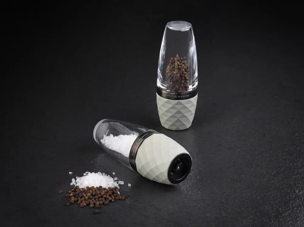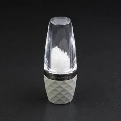 Eine stilvolle und moderne Salzmühle, die von der urbanen britischen Architektur inspiriert wurde. Hergestellt aus kristallklarem Acryl und Beton. Die klare Acrylplatte bildet einen guten Kontrast zur geometrischen, hellgrauen Betonbasis, die durch den Rotgussring in der Mitte betont wird. Der Beton wurde mit einer Schicht Klarlack versehen, um seine Oberfläche zu schützen. Der Boden verfügt ausserdem über einen Schutzring aus Kunststoff, der verhindert, dass der Beton mit Arbeitsflächen in Kontakt kommt, um Kratzer oder Beschädigungen zu vermeiden. Ausgestattet mit diamantscharfem Keramikmahlwerk. Die Mühle ist mit grobem Meersalz aus Belgien gefüllt und kann ab dem Moment, in dem Sie sie erhalten, verwendet werden. Wenn Sie sie nachfüllen müssen, drehen Sie die Mühle einfach um und schrauben Sie die Acrylplatte des Betonunterteils ab. Füllen. Die strapazierfähigen Eigenschaften der Mechanismen wurden in England entwickelt und hergestellt und sorgen dafür, dass Sie immer eine konstant herausragende Leistung erhalten. Um den Mahlgrad von fein auf grob einzustellen, ziehen Sie einfach den Knopf am Boden der Mühle fest oder lösen Sie ihn. Verwenden Sie eine grobe Einstellung für Steaks oder Tomatensalat, eine mittlere Einstellung für Pizza und eine feine Einstellung für Suppen und Saucen. Nachdem Sie die gewünschte Mahlgradgrösse ausgewählt haben, halten Sie die Mühle fest am Betonabschnitt und drehen Sie am Rotgussring.