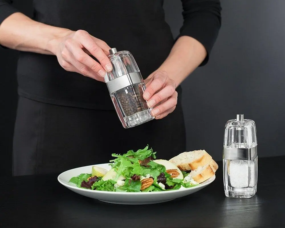 Eine hochwertige 2-in-1-Pfeffermühle und Salzstreuer im modernen Stil. Drehen Sie es bequem um, um Salz aus dem Salzstreuer abzugeben, oder drehen Sie die Kappe, um Pfeffer zu mahlen. Die Seville Combi Mühle ist ein großartiger Artikel um jedem Tisch, Stil zu verleihen und gleichzeitig ein alltägliches Küchenwerkzeug zu bleiben – insbesondere für diejenigen, denen es an Schrank- oder Tischflächen mangelt. Stellen Sie den Schliff von fein auf grob ein, indem Sie den Knopf am Deckel festziehen oder lösen. Wir empfehlen die Verwendung von hochwertigen Pfefferkörnern und Meersalz.