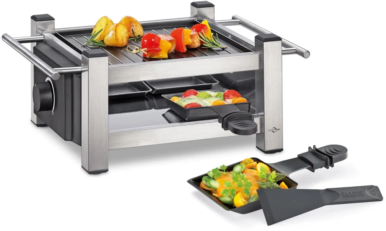 Raclette Taste 4. Mit antihaftbeschichteter Grillplatte, 4 Pfännchen und 4 Schabern für geselliges Kochen bei Tisch.