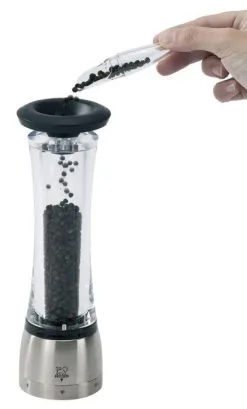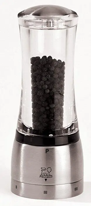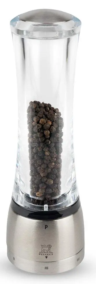 Pfeffermühle Daman in Acryl/Edelstahl mit justierbarem Mahlgrad. Die neue Mahlgradverstelltechnik der Pfeffermühle stellt eine von PEUGEOT patentierte Revolution im Mühlenbau dar.