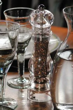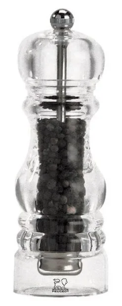 Pfeffermühle Nancy aus Acryl. Der transparente Korpus im klassischen Design läßt schnell die Füllmenge und den Inhalt bestimmen. Das Pfeffermahlwerk der PEUGEOT Pfeffermühle, bestehend aus einer zweireihigen Spiralverzahnung, führt und hält die Pfefferkörner für ein perfektes Mahlergebnis.