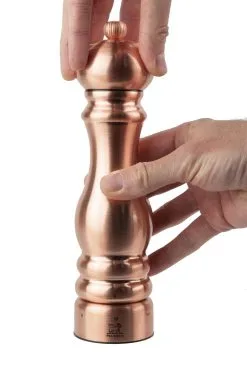 Salz und Pfeffer dürfen in keinem Haushalt fehlen. Die Pfeffermühle Paris u´select von PEUGEOT wird manuell betrieben. Sie besticht durch ein modernes Design und einer elegant schimmendern Oberfläche aus Kupfer. Wie alle Mühlen aus der Kollektion „Paris“ verfügen alle Versionen über das patentierte u´select-System zur Einstellung von sechs verschiedenen Mahlgraden – von fein über mittel bis grob.