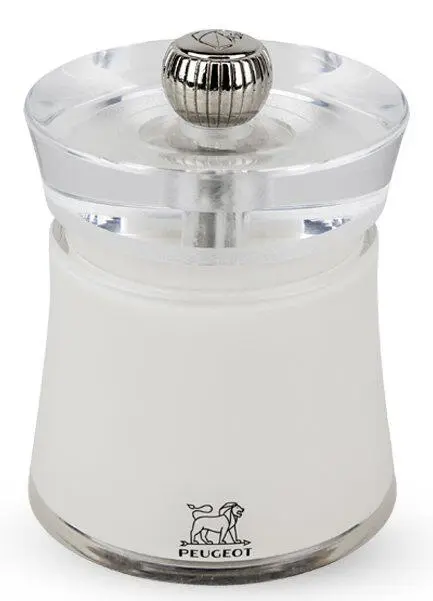 Salzmühle Bali in Acryl weiß. Sie sind klein, aber sie haben die Kraft des Löwen: Die Mühlen aus der Serie Bali von Peugeot. Jetzt kommen die kleinen Starken in den Modefarben der Sommer-Saison: Schwarz und Weiß.