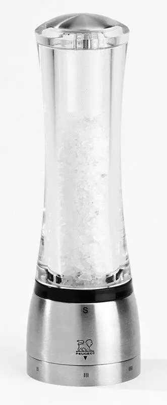 Salzmühle Daman in Acryl/Edelstahl mit justierbarem Mahlgrad. Die neue Mahlgradverstelltechnik der Salzmühle stellt eine von PEUGEOT patentierte Revolution im Mühlenbau dar.