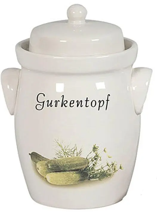 Dekorativer Steinguttopf von Schmitt, mit dem Sie Ihre Gurken ganz einfach selbst einmachen und dabei noch die gesunden VorzĂŒge der MilchsĂ€uregĂ€rung genieĂen können.