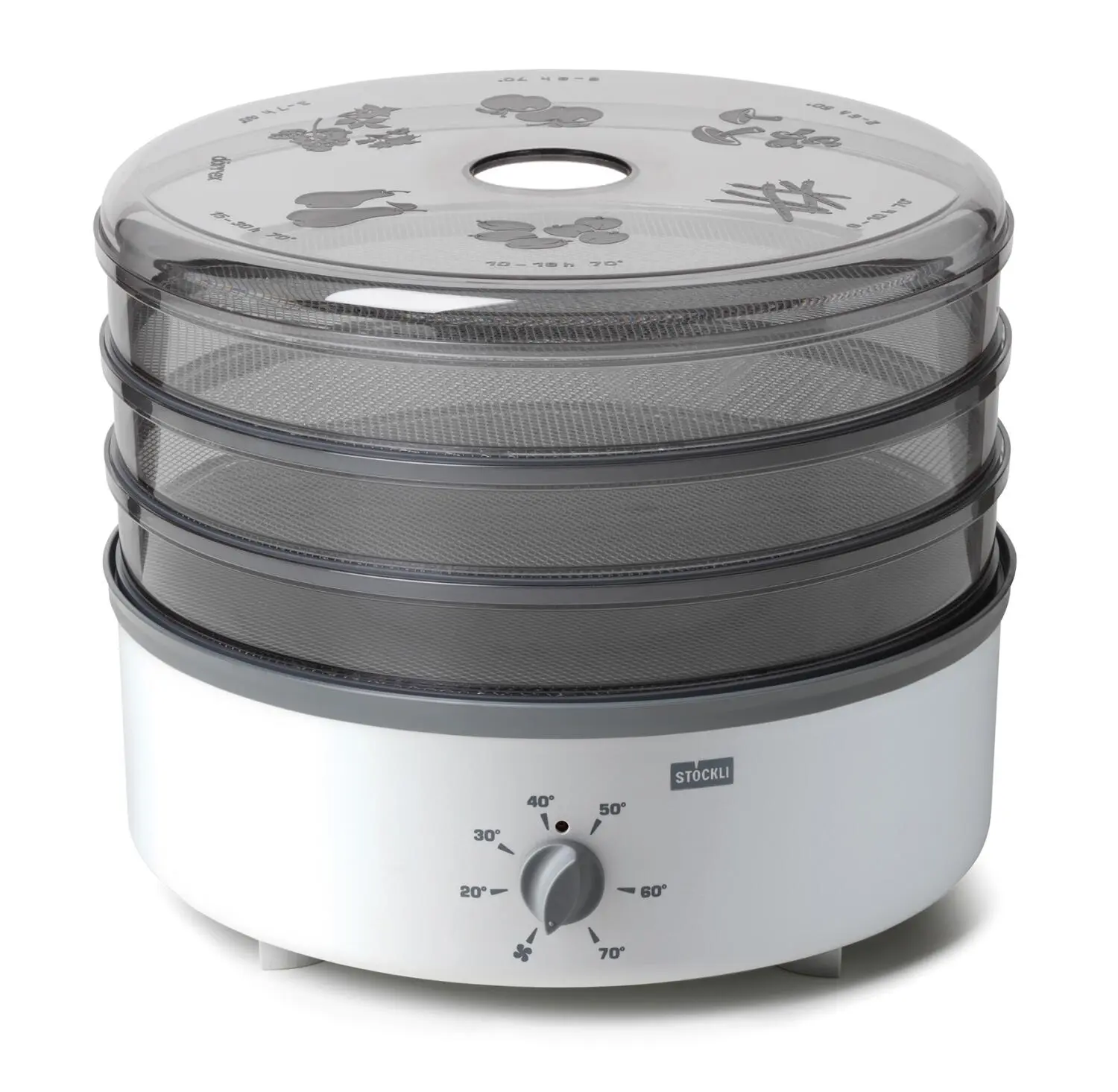 Mit dem Stöckli dörrex Dörrautomat aus pflegefreundlichen Kunststoffgehäuse wird das Trocknen von Früchten, Kräutern und Fleisch zum Kinderspiel! Die verschiedenen Dörrzeiten für das jeweilige Dörrgut sind auf dem transparenten Deckel eingeprägt. Durch die stufenlose Temperaturfeineinstellung und aktive Warmluftzirkulation wird ein perfektes Dörrergebnis garantiert. Die feinmaschigen Metall-Dörrgitter eignen sich u. a. sehr gut zum Trocknen von Kräutern. Insgesamt kann das Gerät mit bis zu 10 Dörrgittern betrieben werden. Inklusive 3 Metall-Dörrgittern und LED-Anzeige, die leuchtet, wenn die Heizung im Betrieb ist.