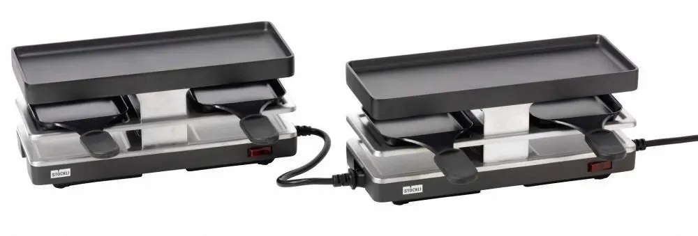 Stöckli Raclette Twinboard Set. Das Raclette- und Grillgerät, bestehend aus einem Basis- und einem Endgerät, ist für zwei bis zu vier Personen geeignet.